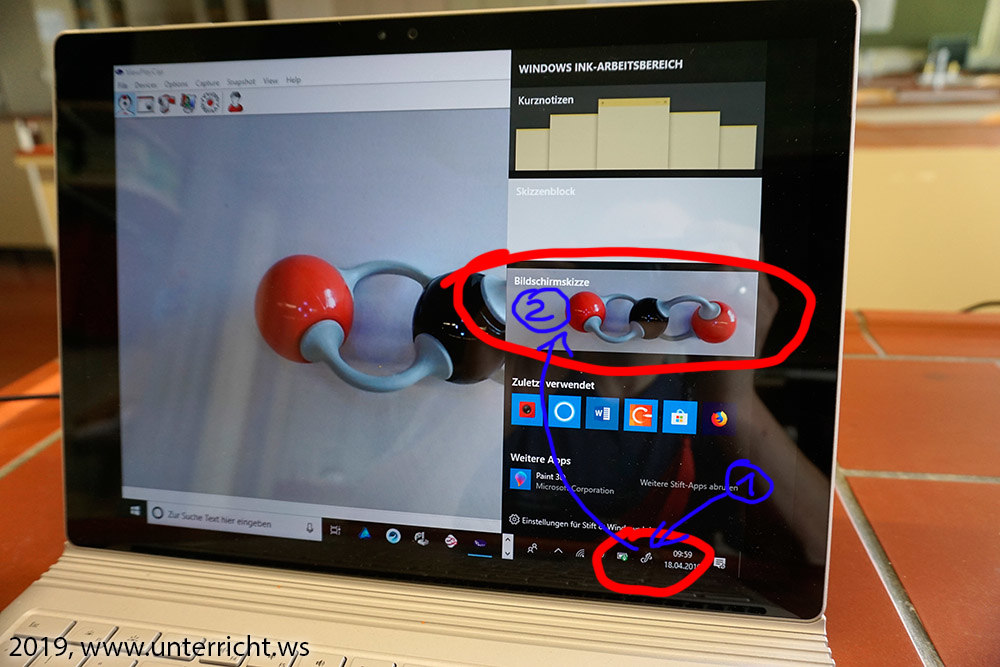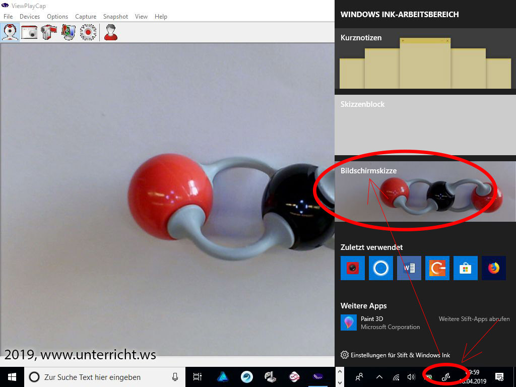 Wird das Kamerabild auf dem Bildschirm angezeigt, kann jederzeit durch den „Windows 10 – Ink Arbeitsbereich“ -> Bildschirmskizze ein Bildschirmfoto gemacht werden, welches mit Notizen, Markierungen usw. ergänzt wird.